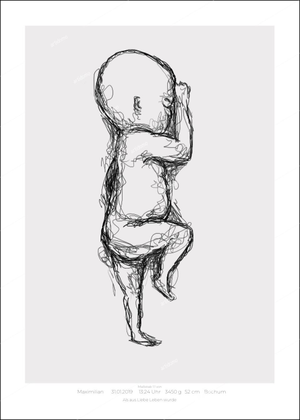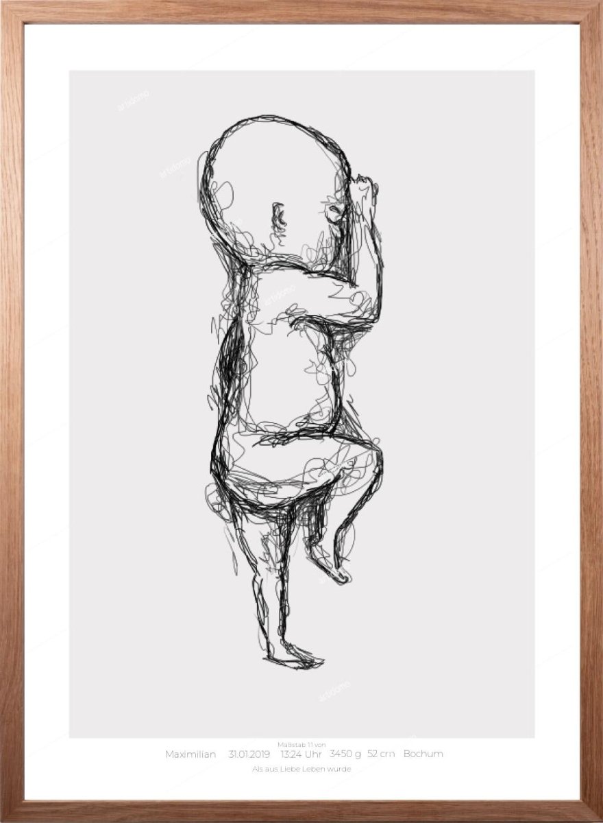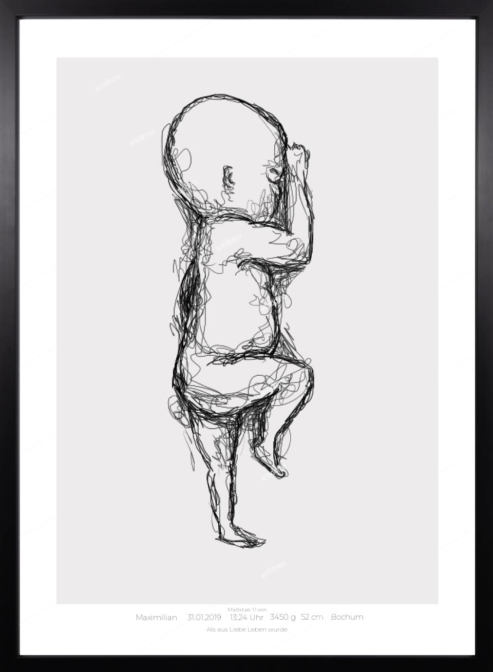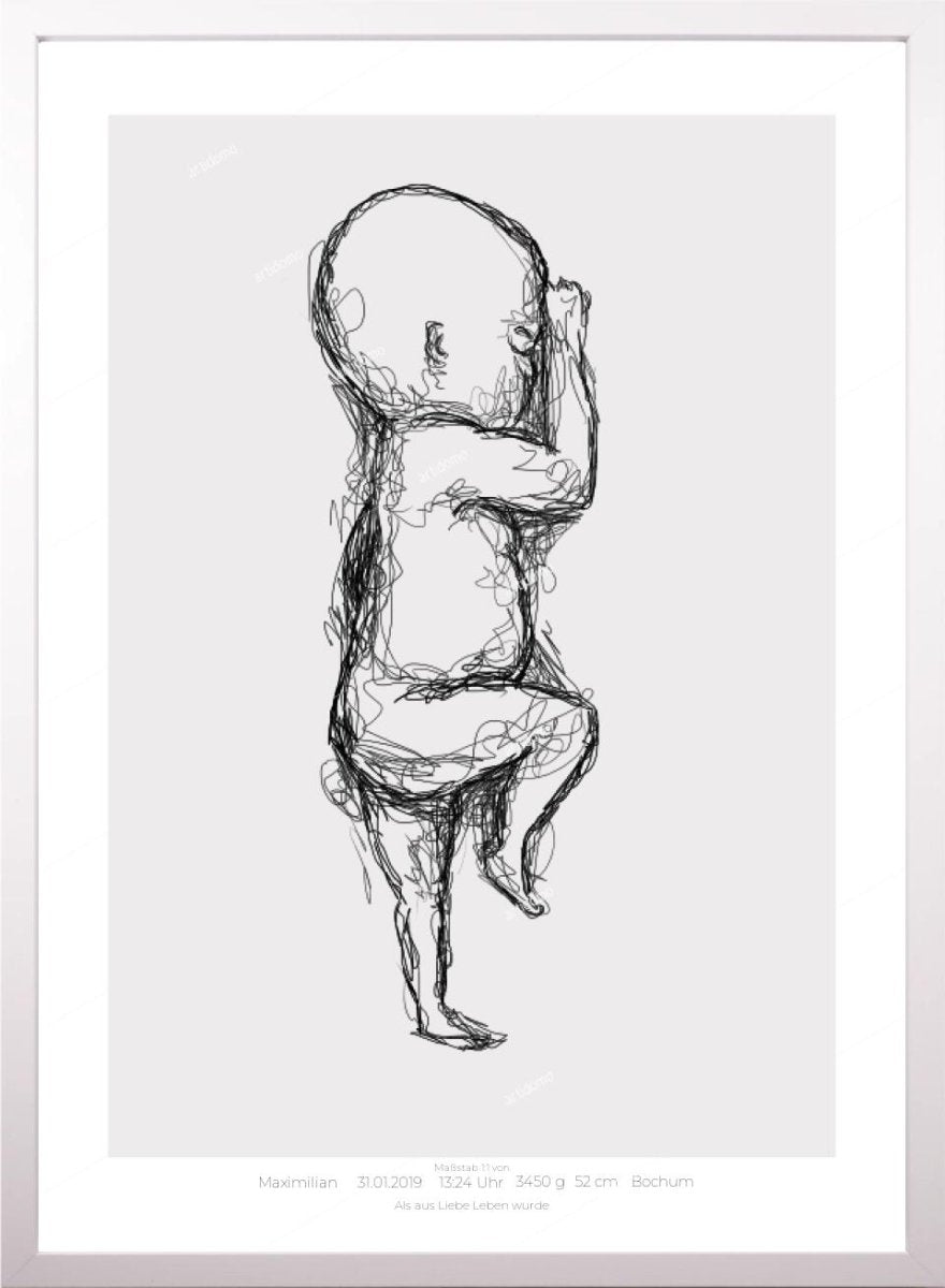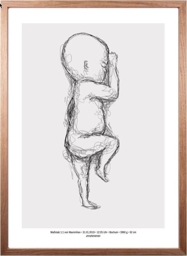 Dieses Geburtsposter zeigt dein Kind in seiner exakten Geburtsgröße (Maßstab 1:1) – so, wie es in deinem Arm lag, als ihr euch zum ersten Mal begegnet seid.